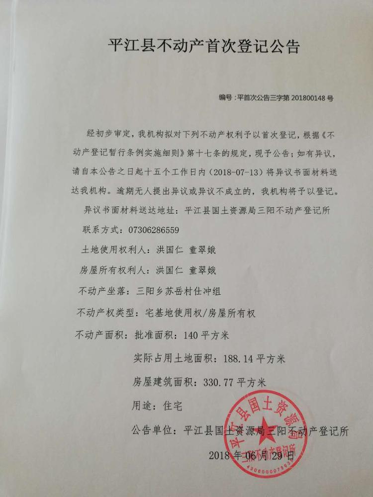三阳乡 洪国仁 童翠娥 不动产首次登记