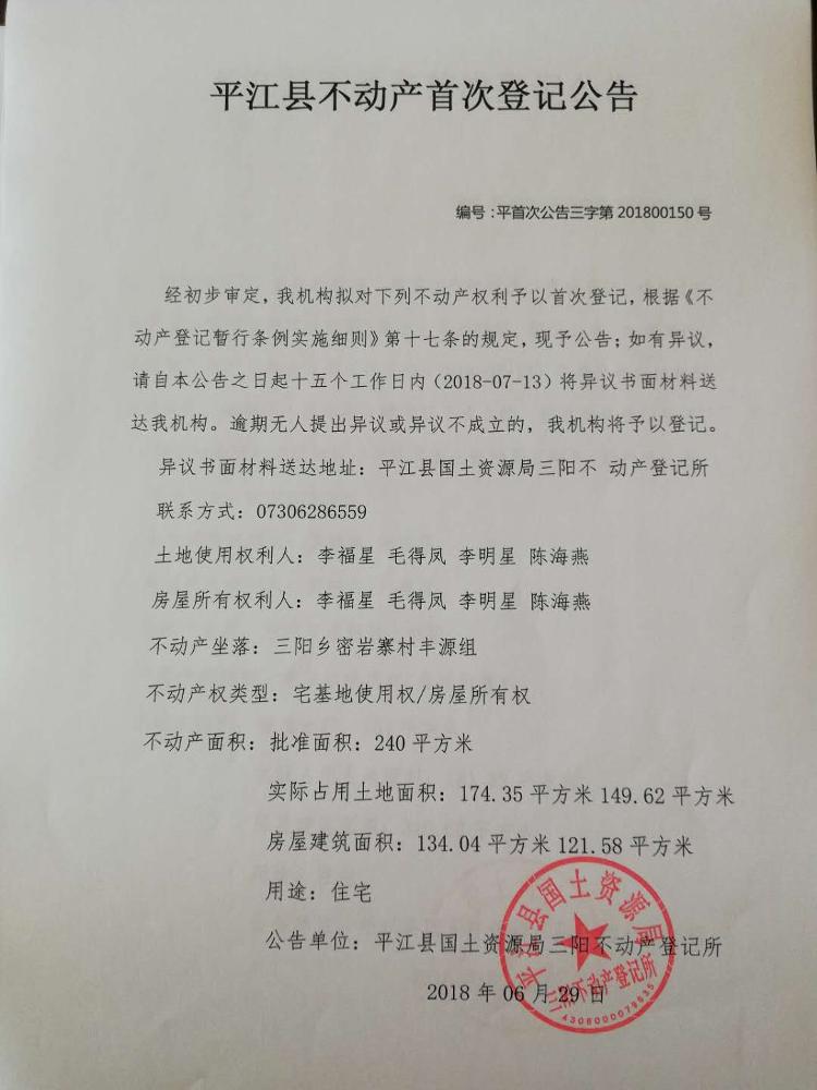 三阳乡 李福星 毛得凤 李明星 陈海燕 不动产首次登记