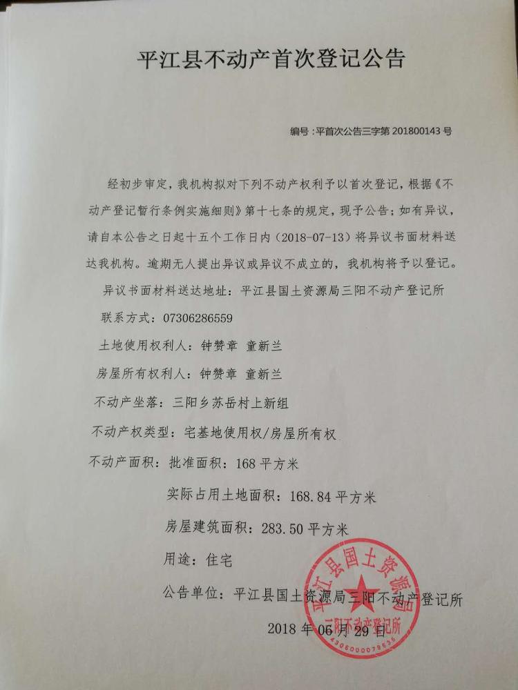 三阳乡 钟赞章 童新兰 不动产首次登记