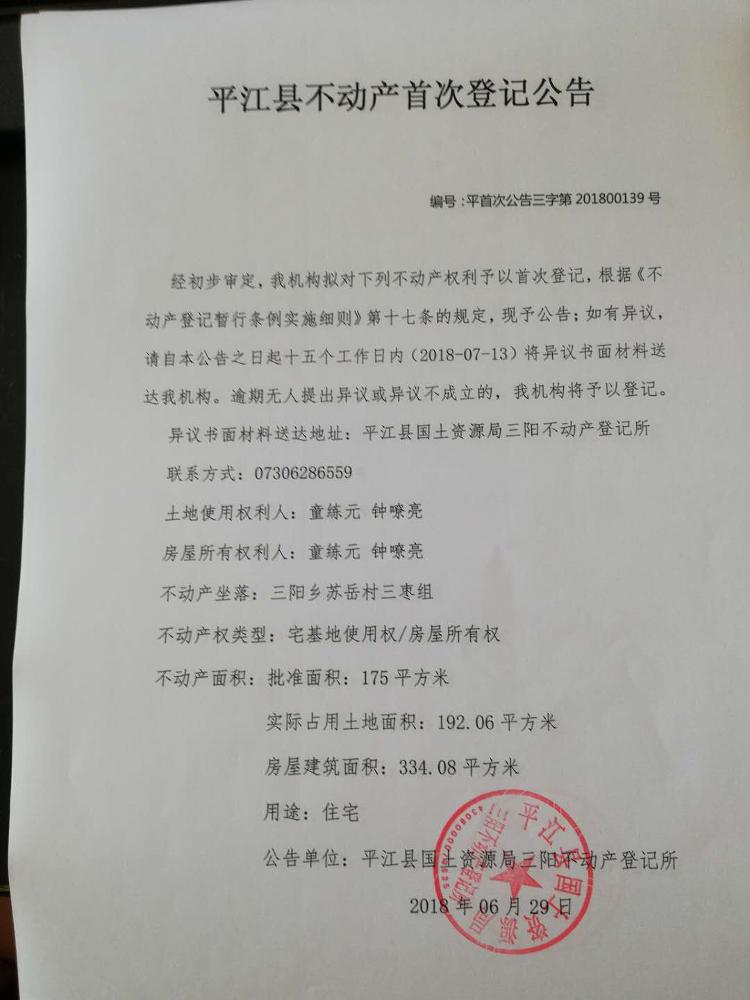 三阳乡 童练元 钟嘹亮 不动产首次登记