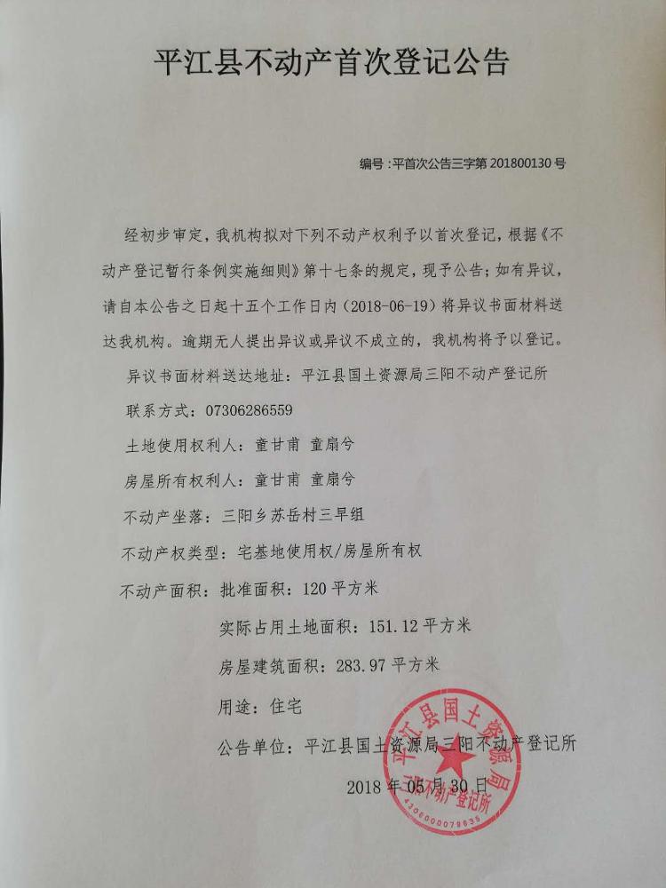 三阳乡 童甘甫 童扇兮 不动产首次登记