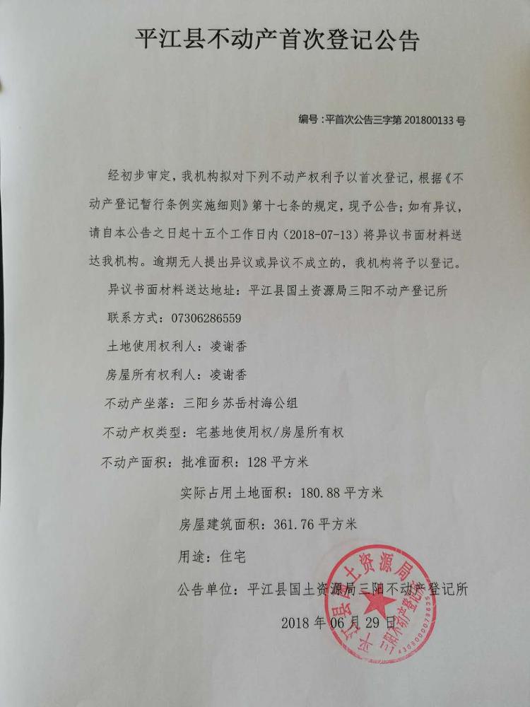 三阳乡 凌谢香不动产首次登记