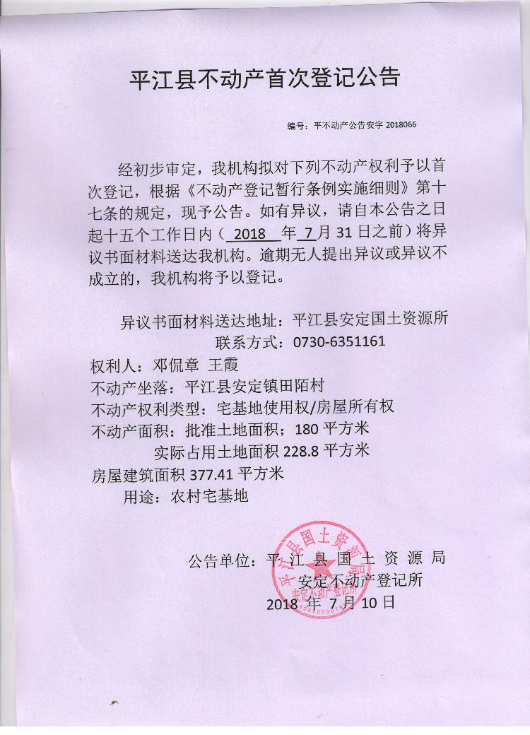 邓侃章 王霞不动产首次登记公告 安字2018066