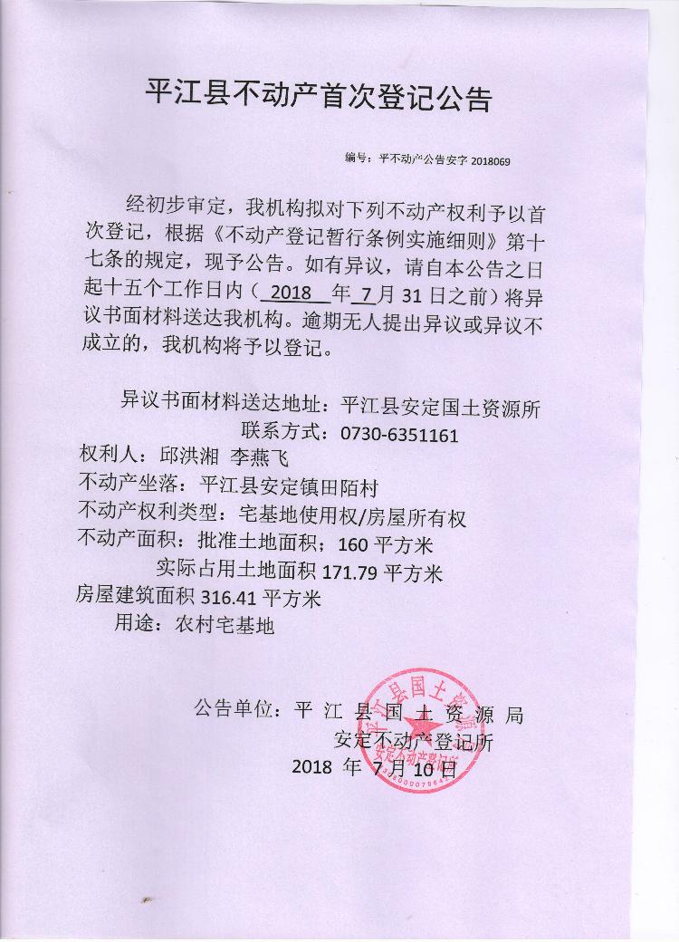 邱洪湘 李燕飞不动产首次登记公告 安字2018069