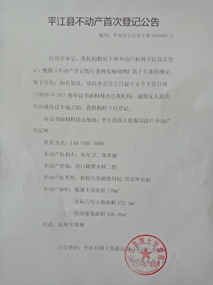 朱红卫 邹秀丽不动产首次登记公告平首次公告浯字第2018001号