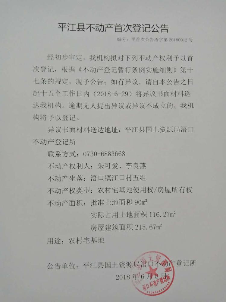 朱可爱 李良燕不动产首次登记公告平首次公告浯字第20180012号