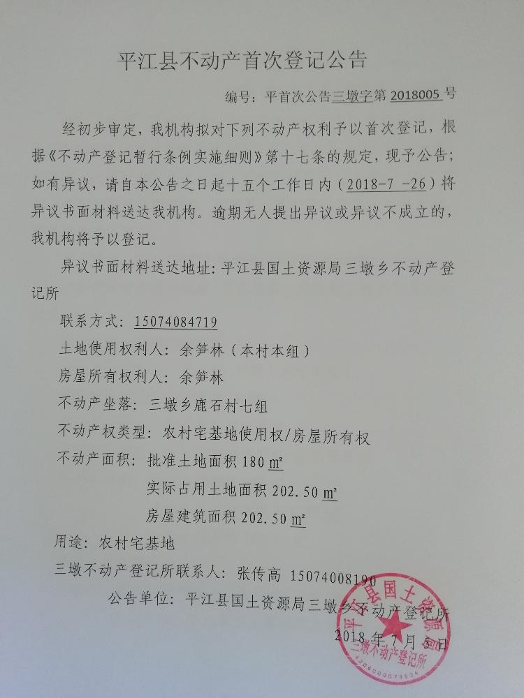 余笋林不动产首次登记公告平首次公告三墩字第2018005号