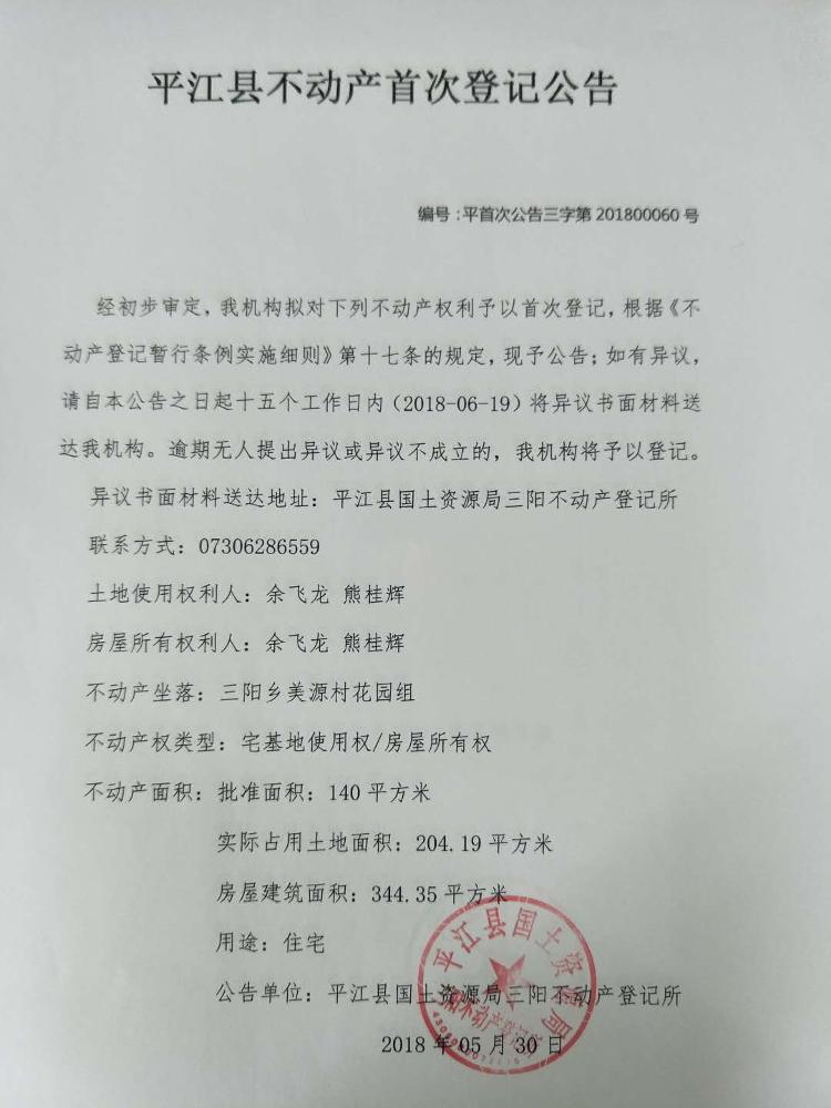 三阳乡 余飞龙 熊桂辉 不动产首次登记公示