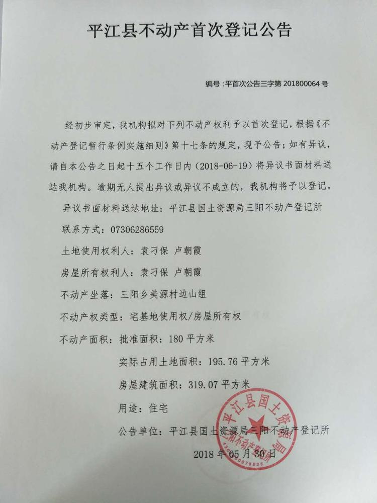 三阳乡 袁刁保 卢朝霞 不动产首次登记公示