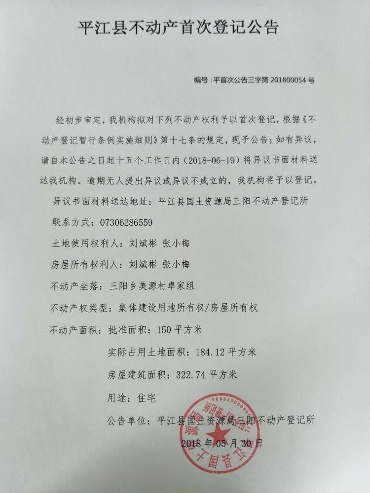 三阳乡 刘斌彬 张小梅 不动产首次登记公示
