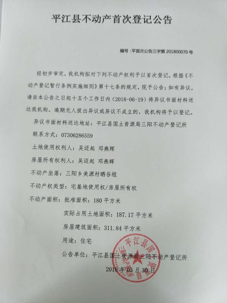 三阳乡 吴迈起 邓燕辉 不动产首次登记公示
