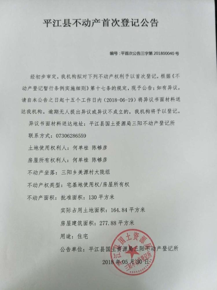 三阳乡 何单桂 陈够彦不动产首次登记公示