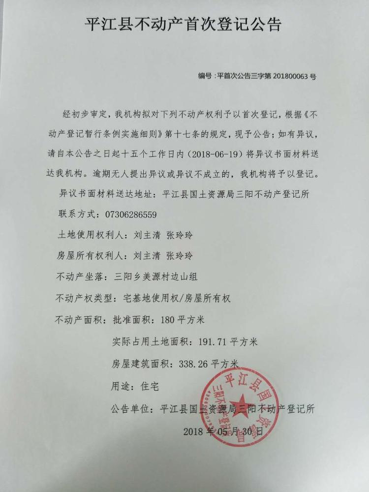 三阳乡 刘主清 张玲玲 不动产首次登记公示