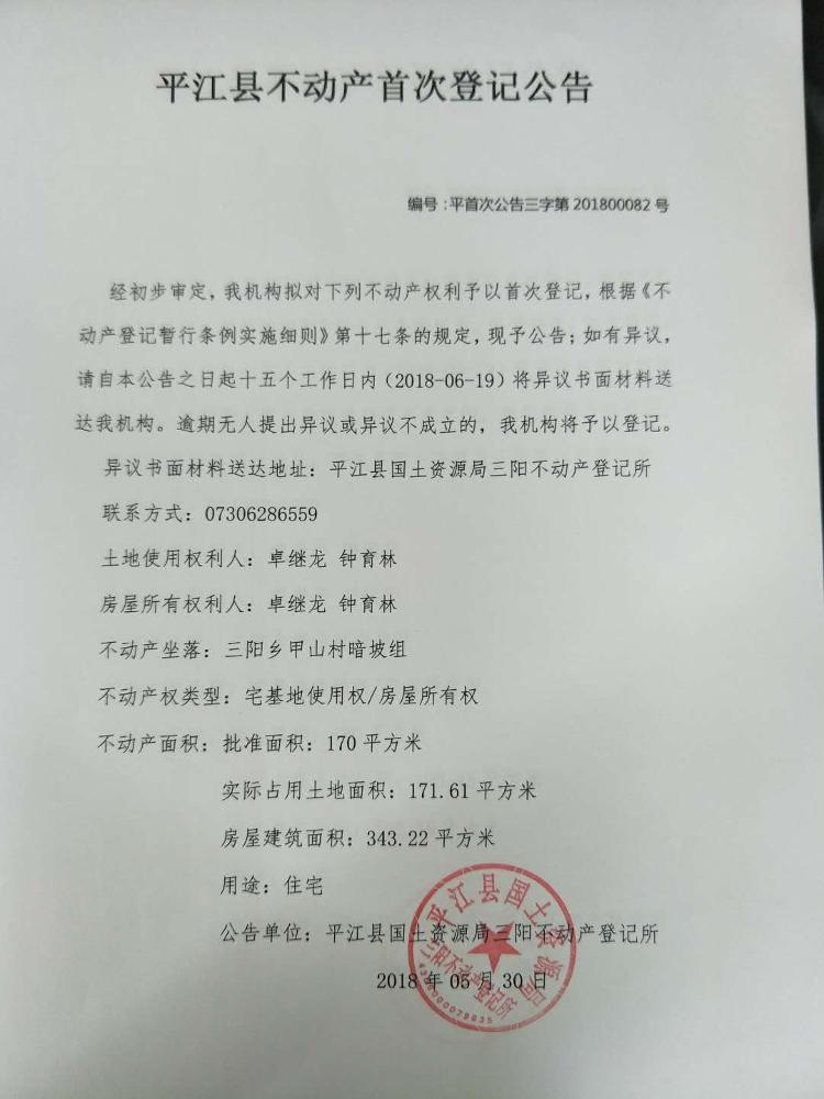 三阳乡卓继龙 钟育林 不动产首次登记公示