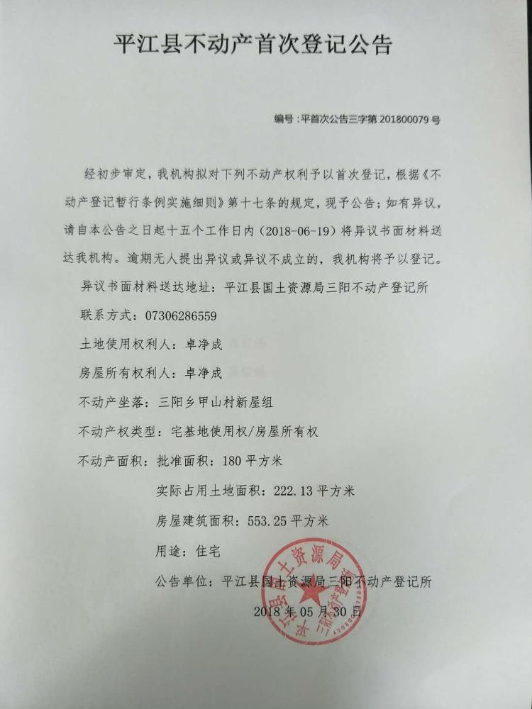 三阳乡卓净成 不动产首次登记公示