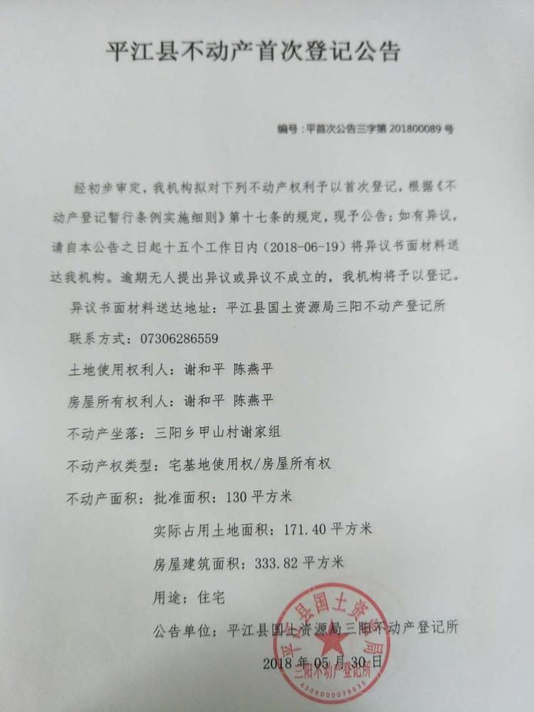 三阳乡谢和平 陈燕平 不动产首次登记公示