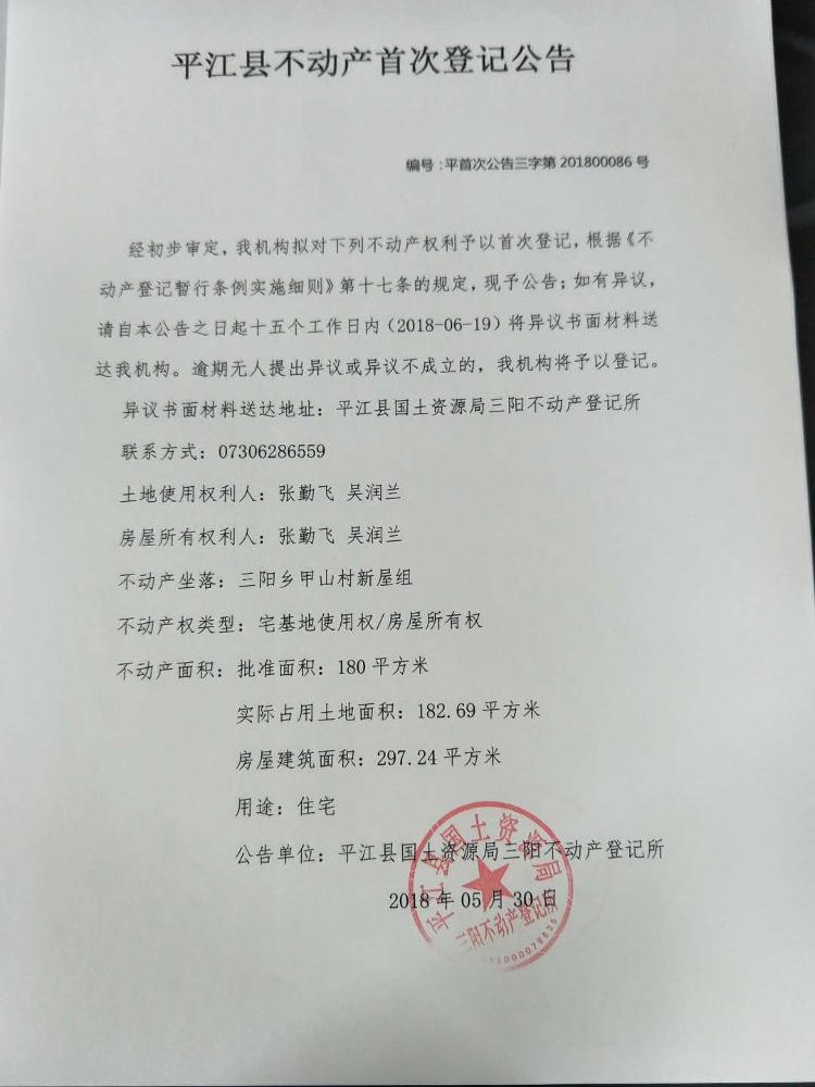 三阳乡张勤飞 吴润兰 不动产首次登记公示