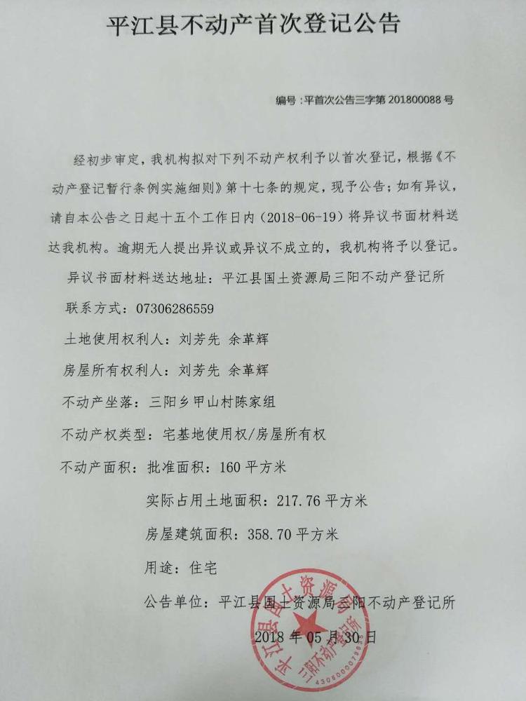 三阳乡刘芳先 余革辉 不动产首次登记公示