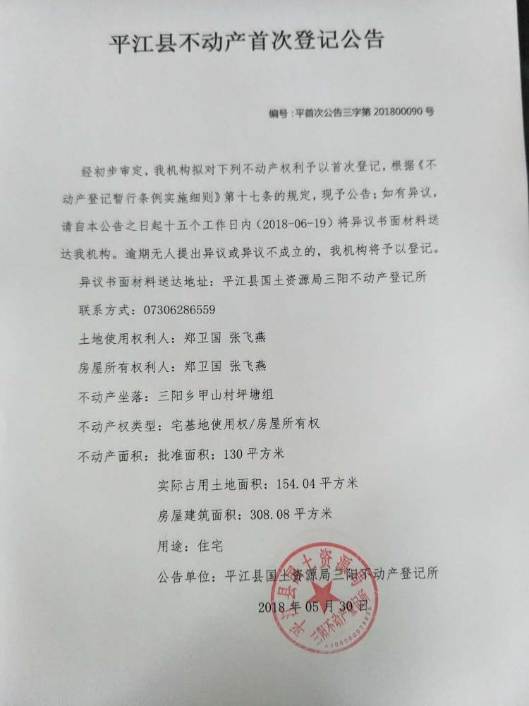 三阳乡郑卫国 张飞燕 不动产首次登记公示