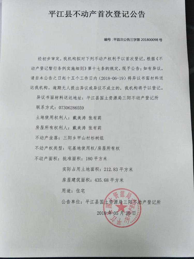 三阳乡戴美涛 张有莉 不动产首次登记公示