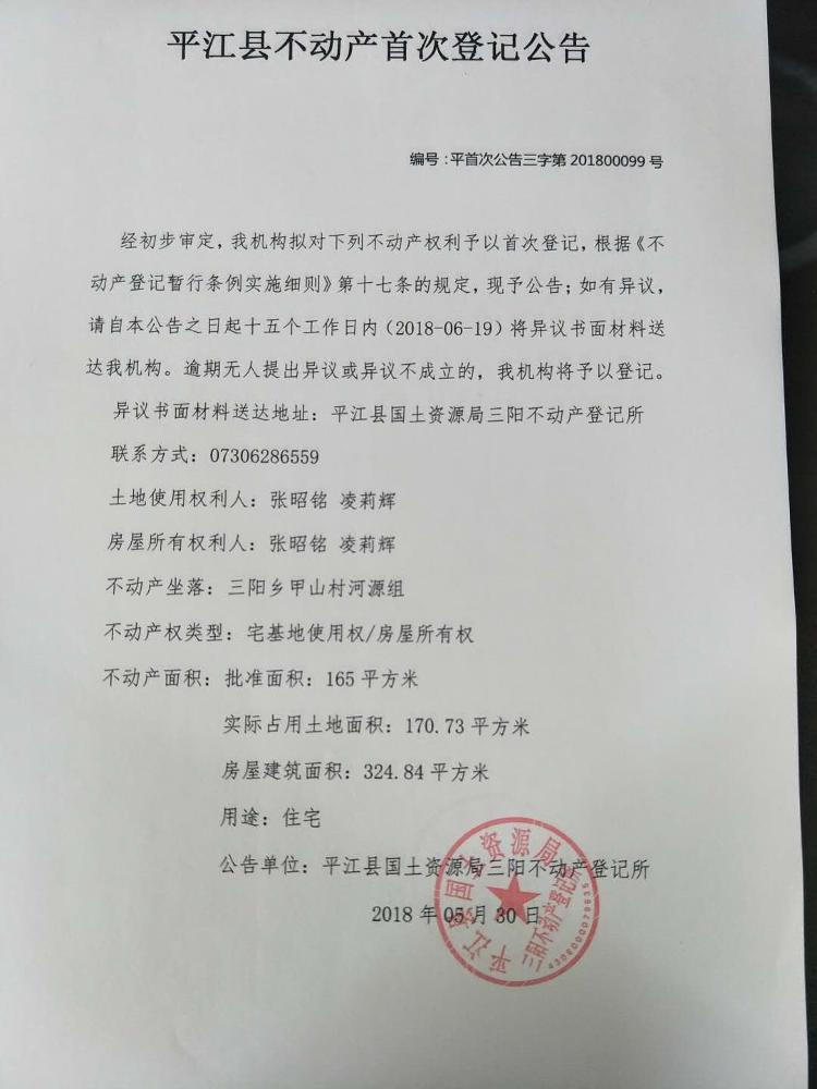三阳乡张昭铭 凌莉辉 不动产首次登记公示