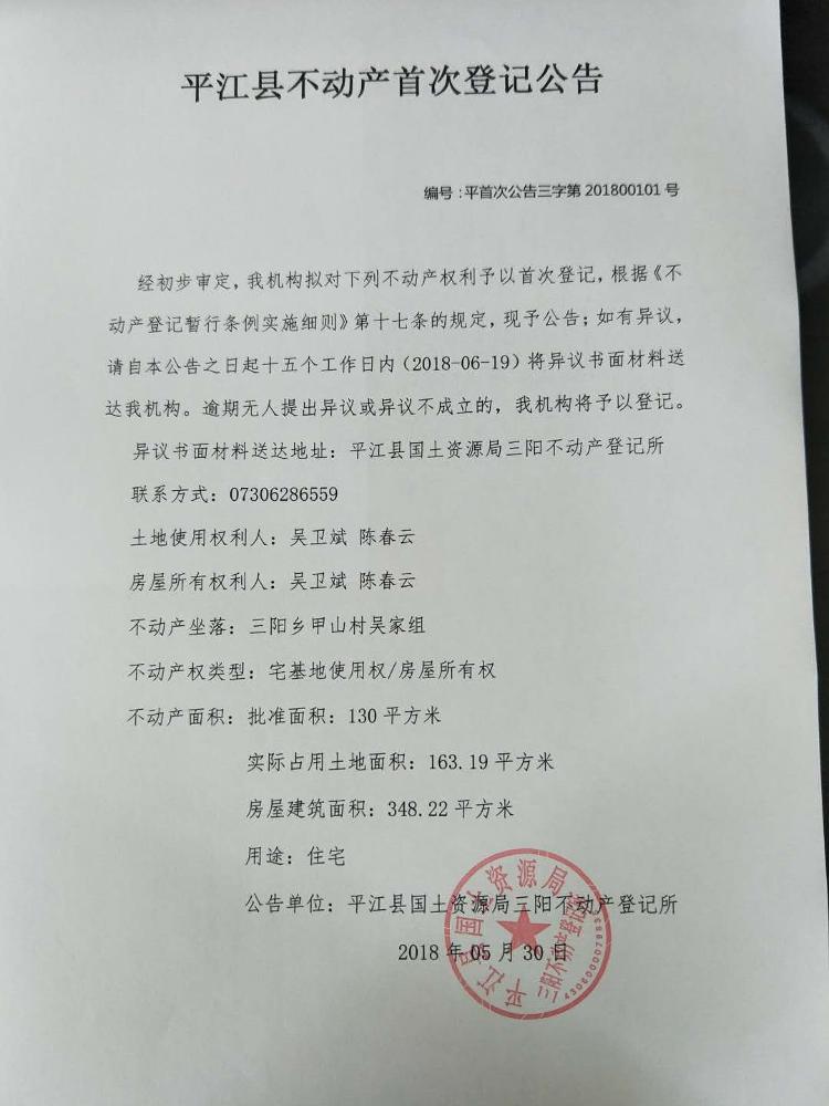 三阳乡吴卫斌 陈春云 不动产首次登记公示