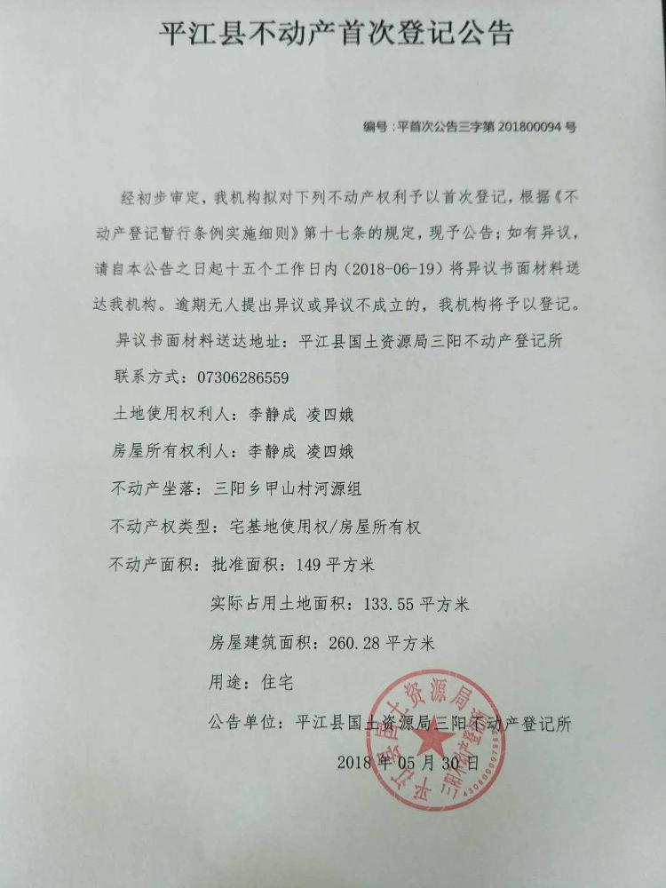 三阳乡李静成 凌四娥 不动产首次登记公示