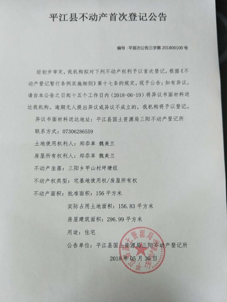 三阳乡郑忝革 魏美兰 不动产首次登记公示