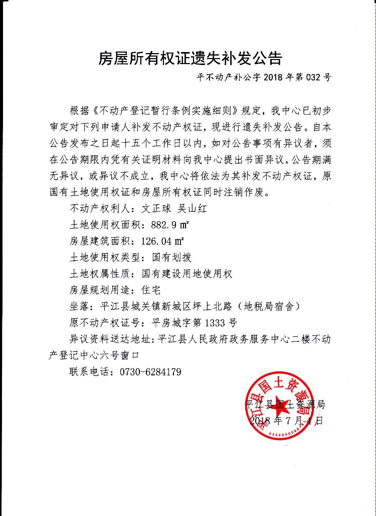 文正球 吴山红房屋所有权证遗失补发公告平不动产补公字2018年第032号