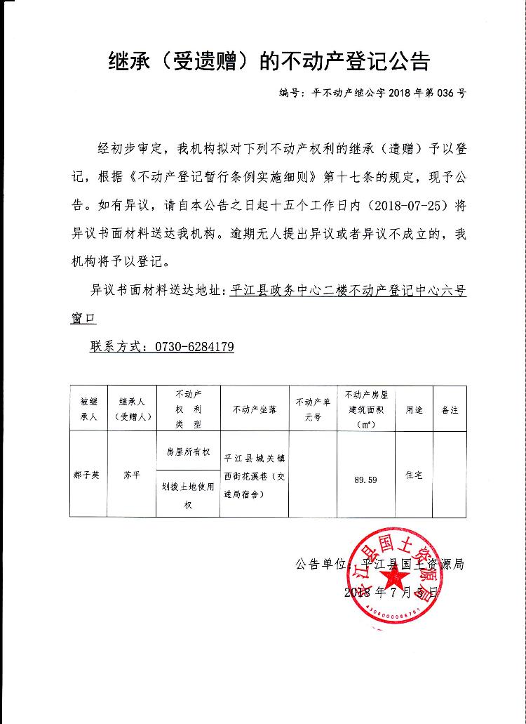 苏平继承(受遗赠)的不动产登记公告平不动产继公字2018年第036号