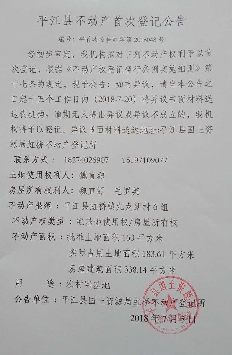 魏直源 毛罗英不动产首次登记公告平首次公告虹字第2018048号