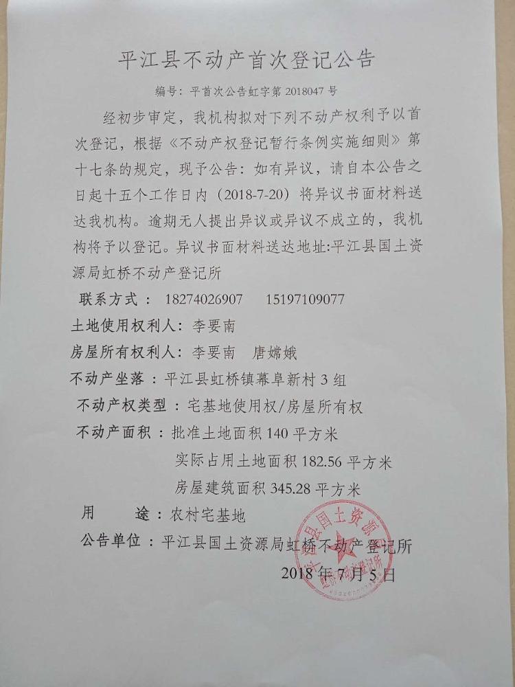 李要南 唐嫦娥不动产首次登记公告平首次公告虹字第2018047号