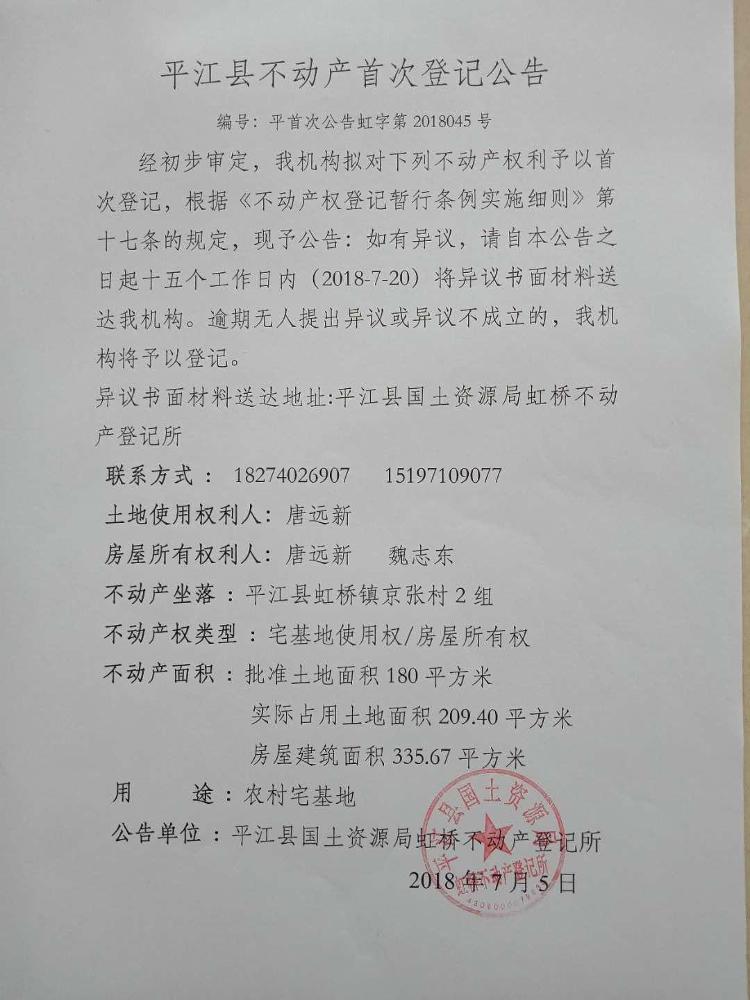 唐元新 魏志东不动产首次登记公告平首次公告虹字第2018045号