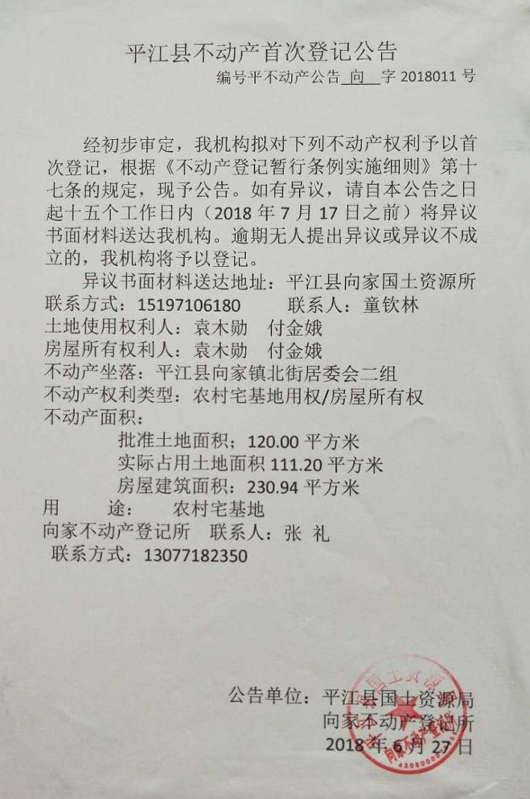 袁木勋 付金娥不动产首次登记公告平不动产公告向字2018011号