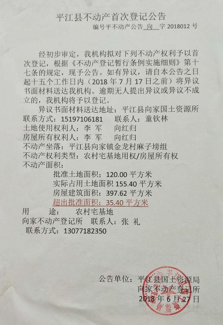 李军 向红归不动产首次登记公告平不动产公告向字2018012号