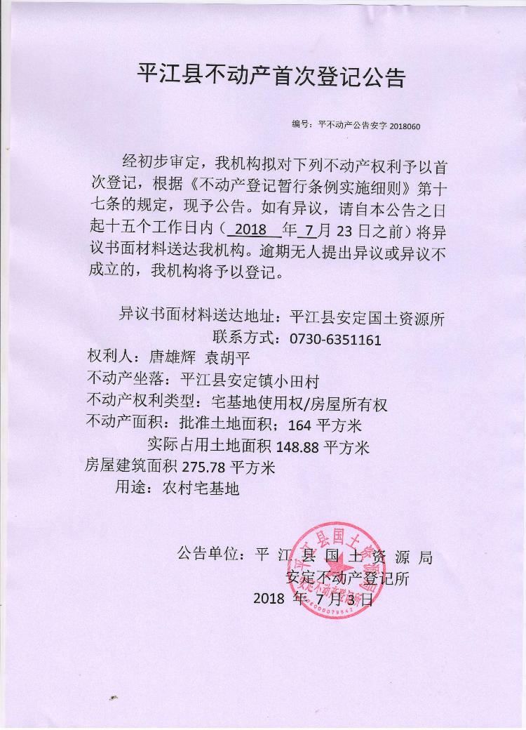 唐雄辉 袁胡平不动产首次登记公告平不动产公告安字2018060