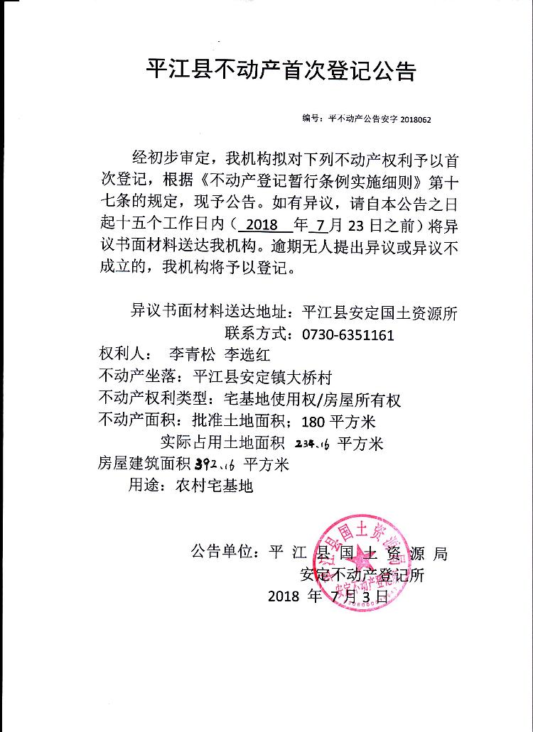 李青松 李选红不动产首次登记公告平不动产公告安字2018062