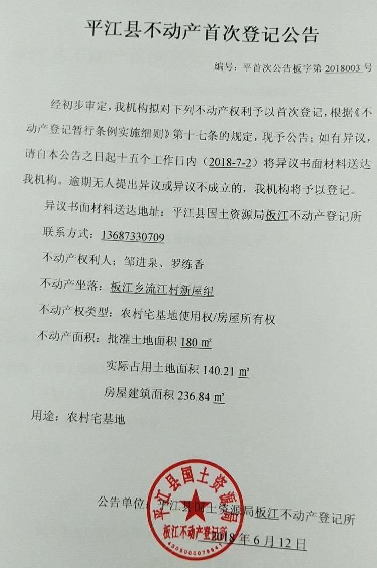 邹进泉 罗练香不动产首次登记公告平首次公告板字第2018003号