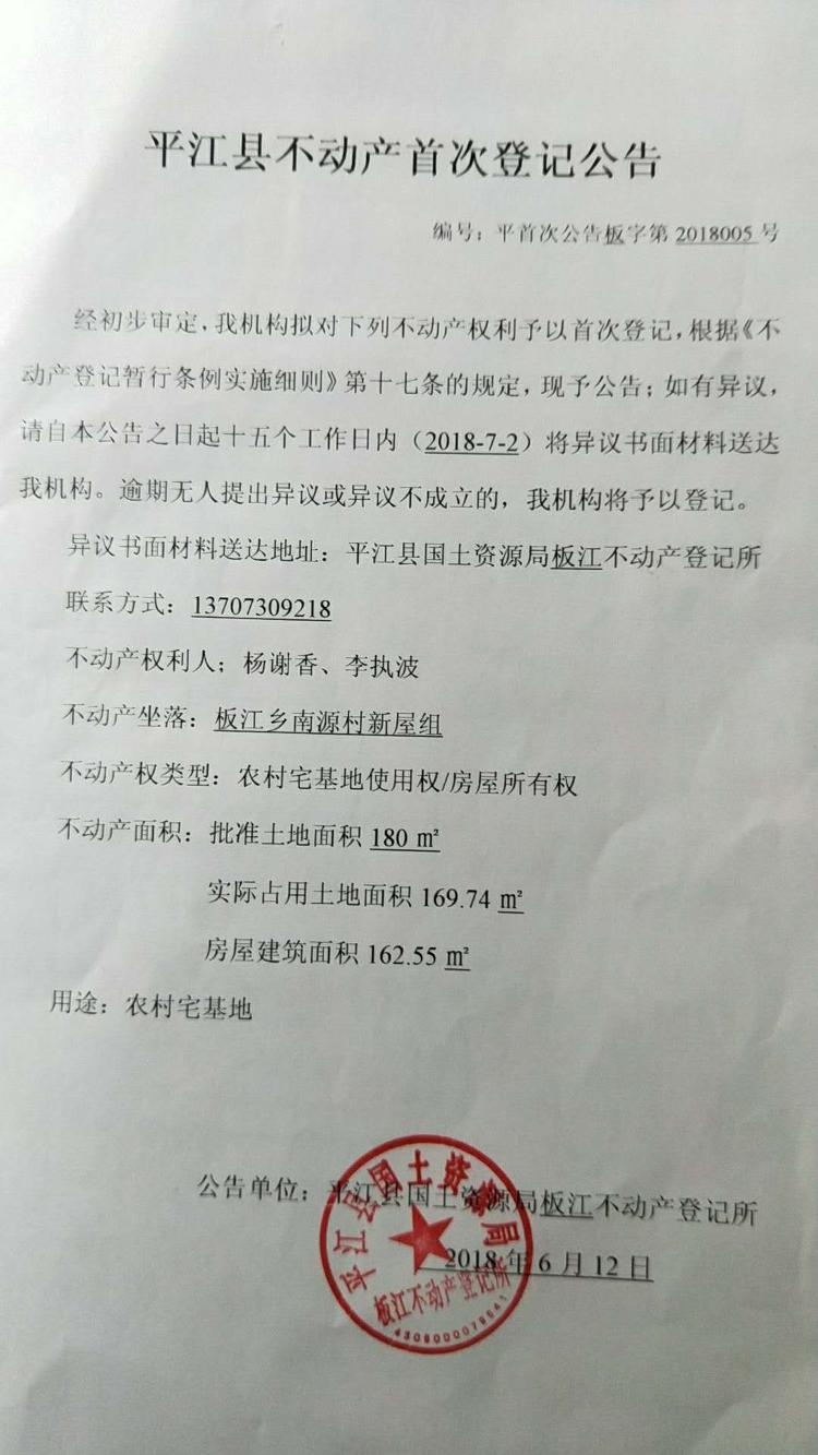 杨谢香 李执波不动产首次登记公告平首次公告板字第2018005号