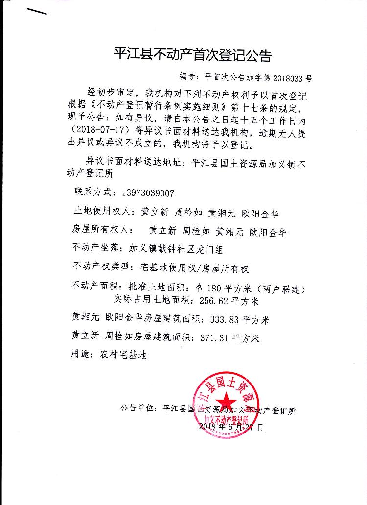 黄立新 周检如 黄湘元 欧阳金华不动产首次登记公告平首次公告加字第2018033号