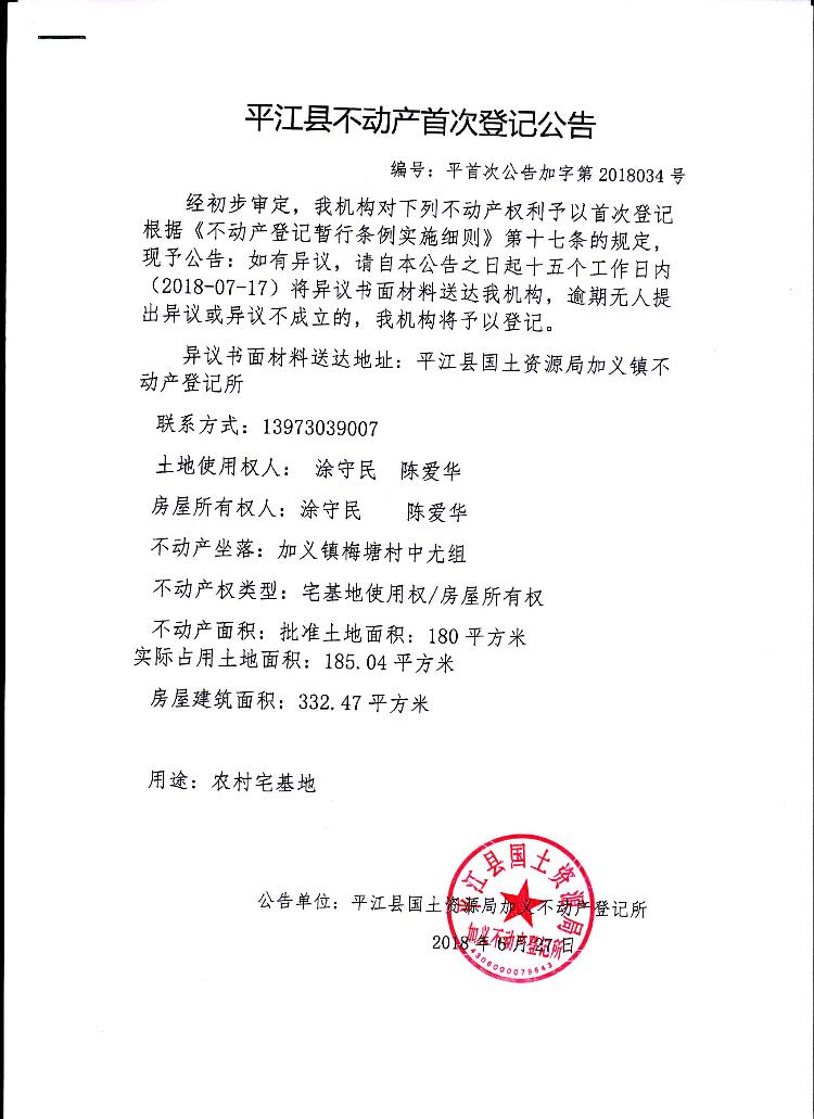 涂守民 陈爱华不动产首次登记公告平首次公告加字第2018034号