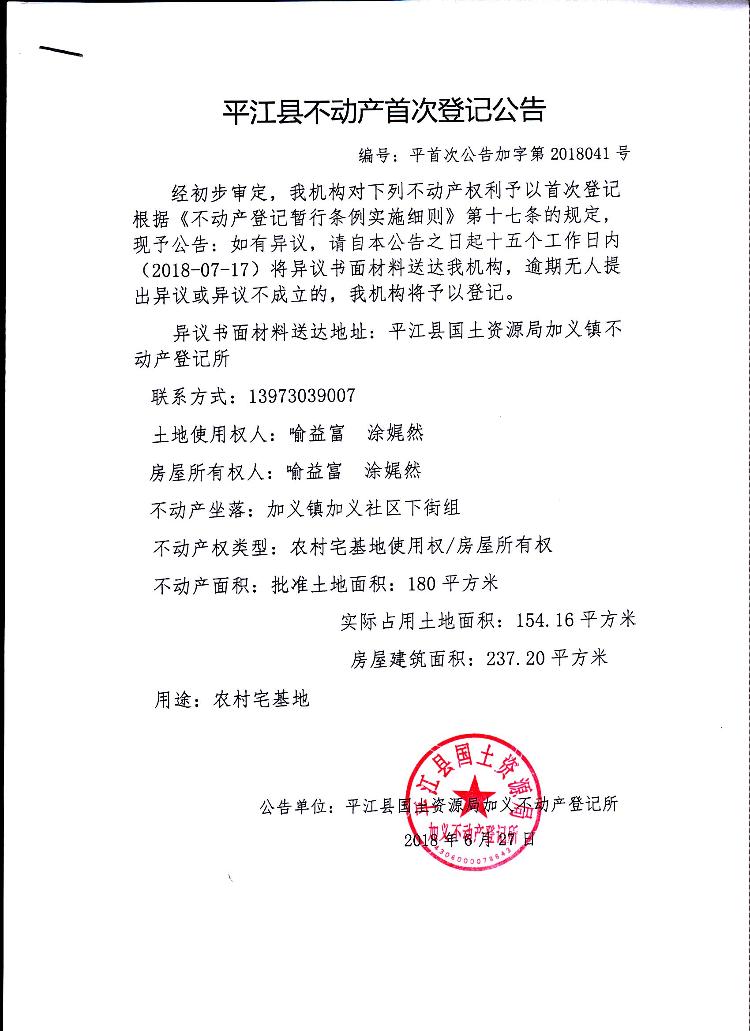 喻益富 涂娓然不动产首次登记公告平首次公告加字第2018041号