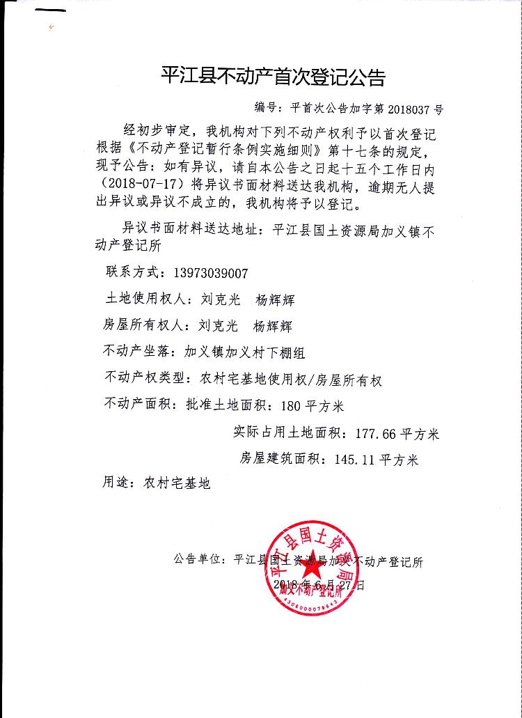 刘克光 杨辉辉不动产首次登记公告平首次公告加字第2018037号