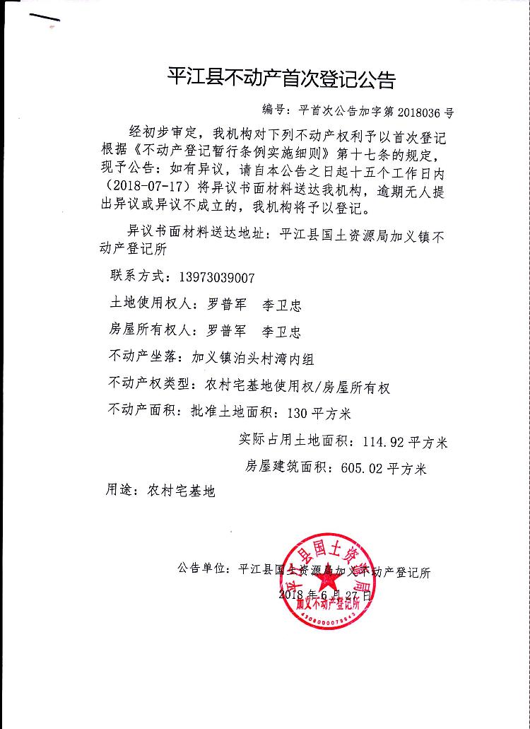 罗普军 李卫忠不动产首次登记公告平首次公告加字第2018036号