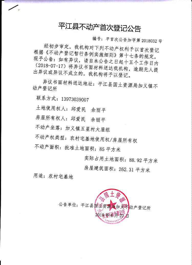 邱爱民 余丽平不动产首次登记公告平首次公告加字第2018032号