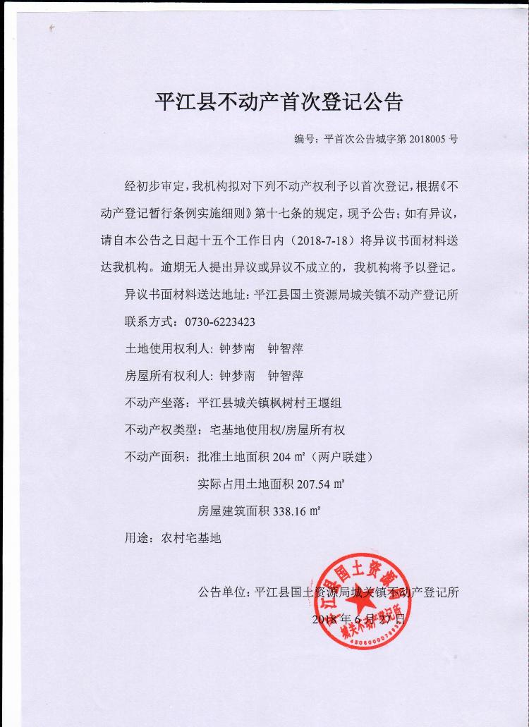 钟梦南 钟智萍 不动产登记首次公告城字第2018005号