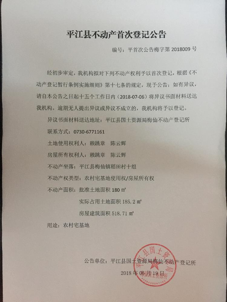 赖跳章 陈云辉不动产首次登记公告平首次公告梅字第2018009号