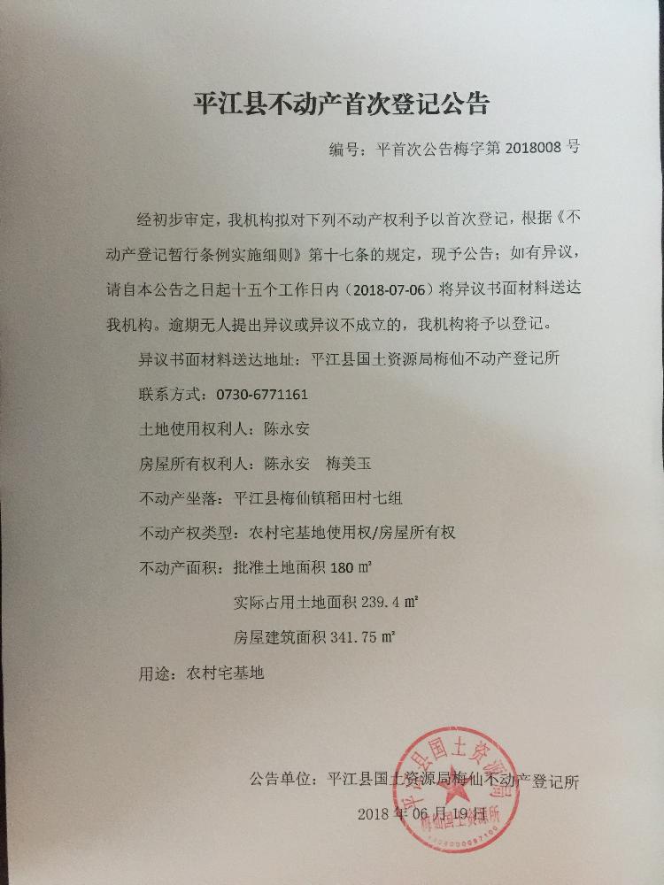 陈永安 梅美玉不动产首次公告平首次公告梅字第2018008号