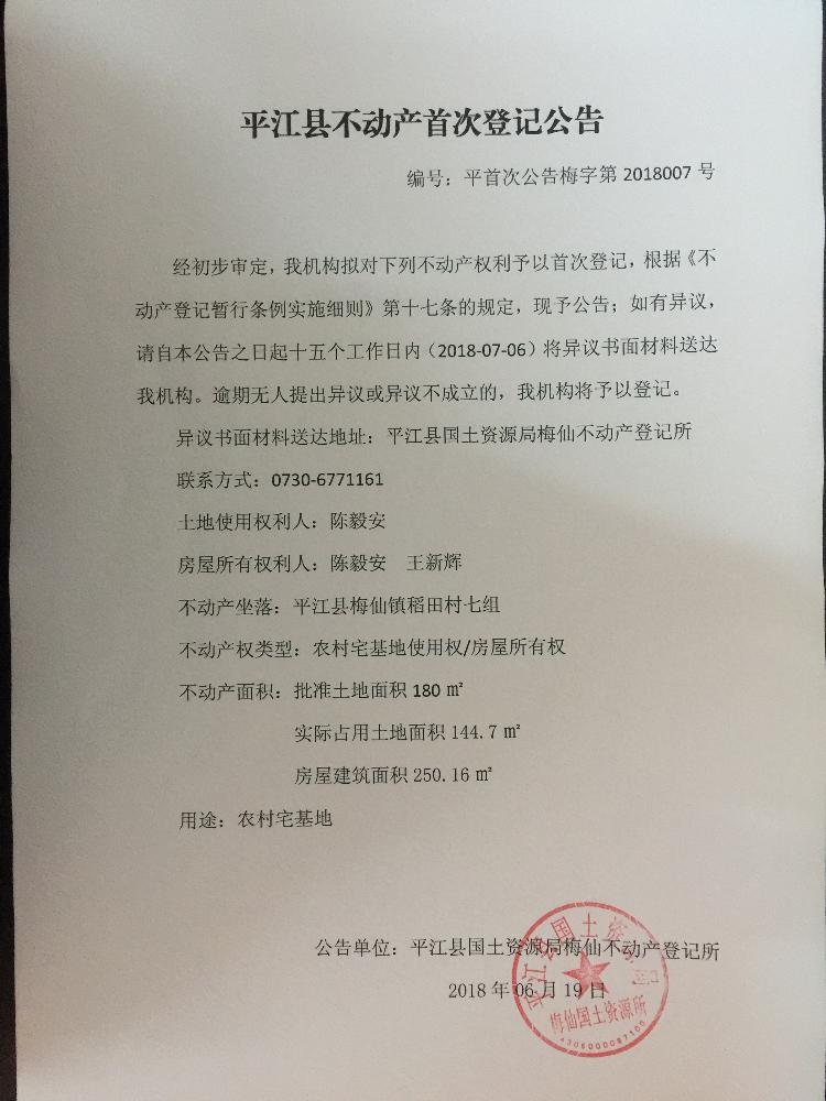 陈毅安 王新辉不动产首次登记公告平首次公告梅字第2018007号
