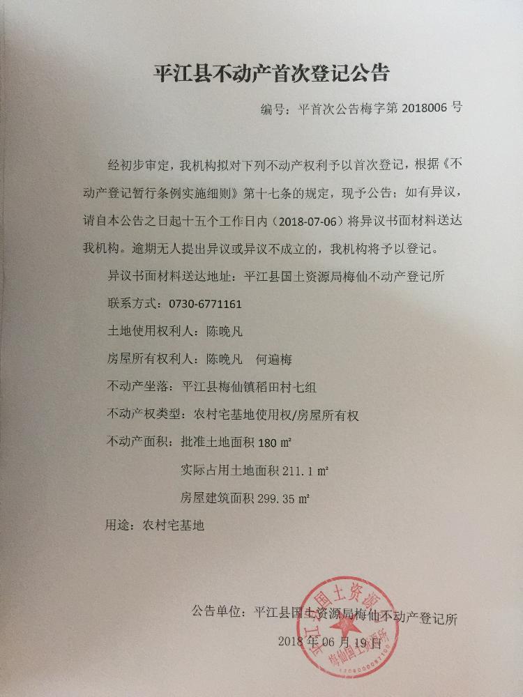 陈晚凡 何遍梅不动产首次登记公告平首次公告梅字第2018006号